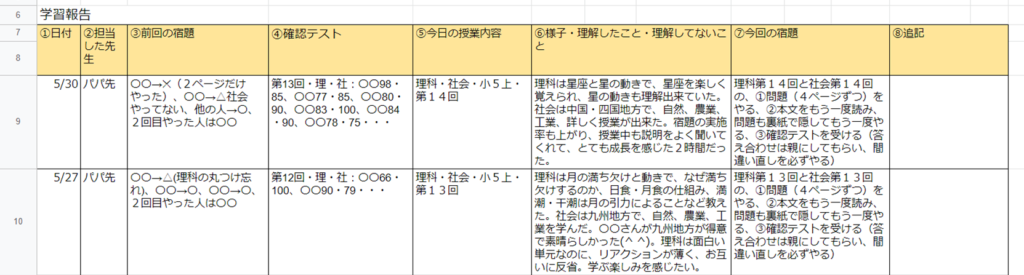 学習状況や宿題の内容は、Googleスプレッドシートに書かれ、スマホで確認することができます。